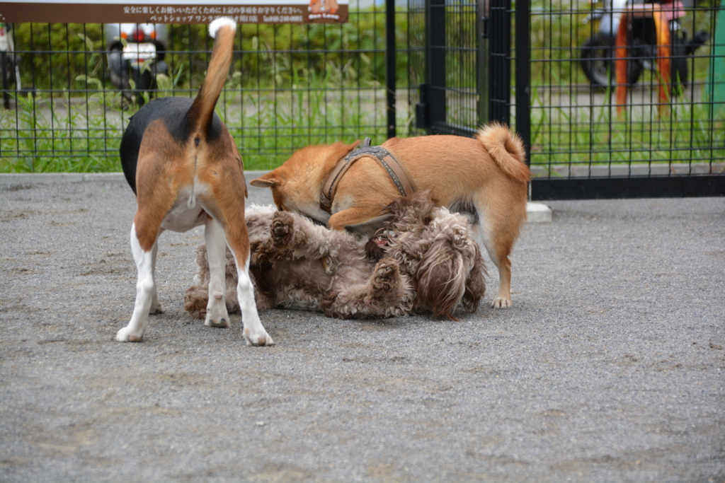 しばらくハチ君と遊んでいると、これまた散歩やドッグランでよく会うビーグルのリーフ君がやってきました。